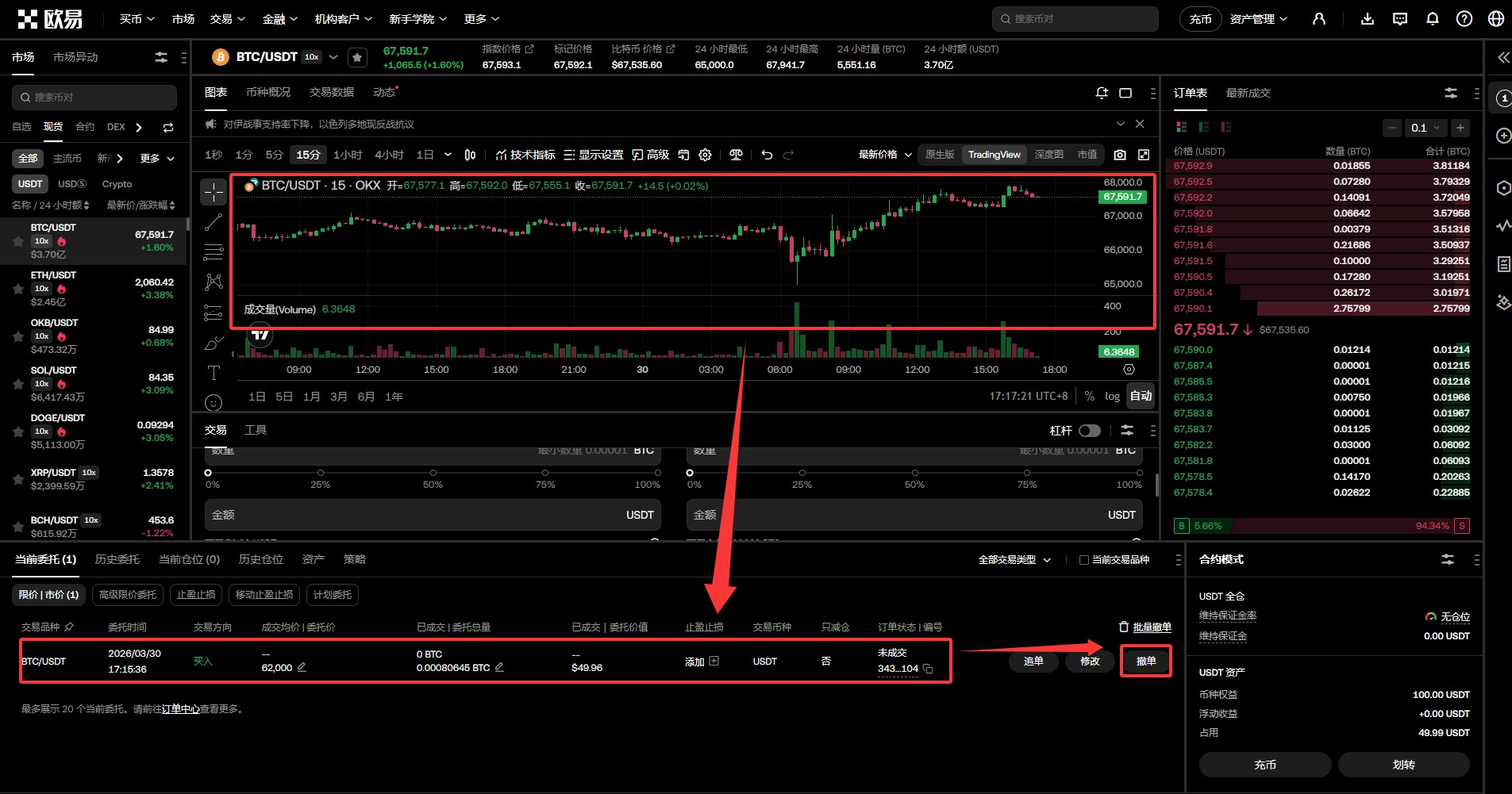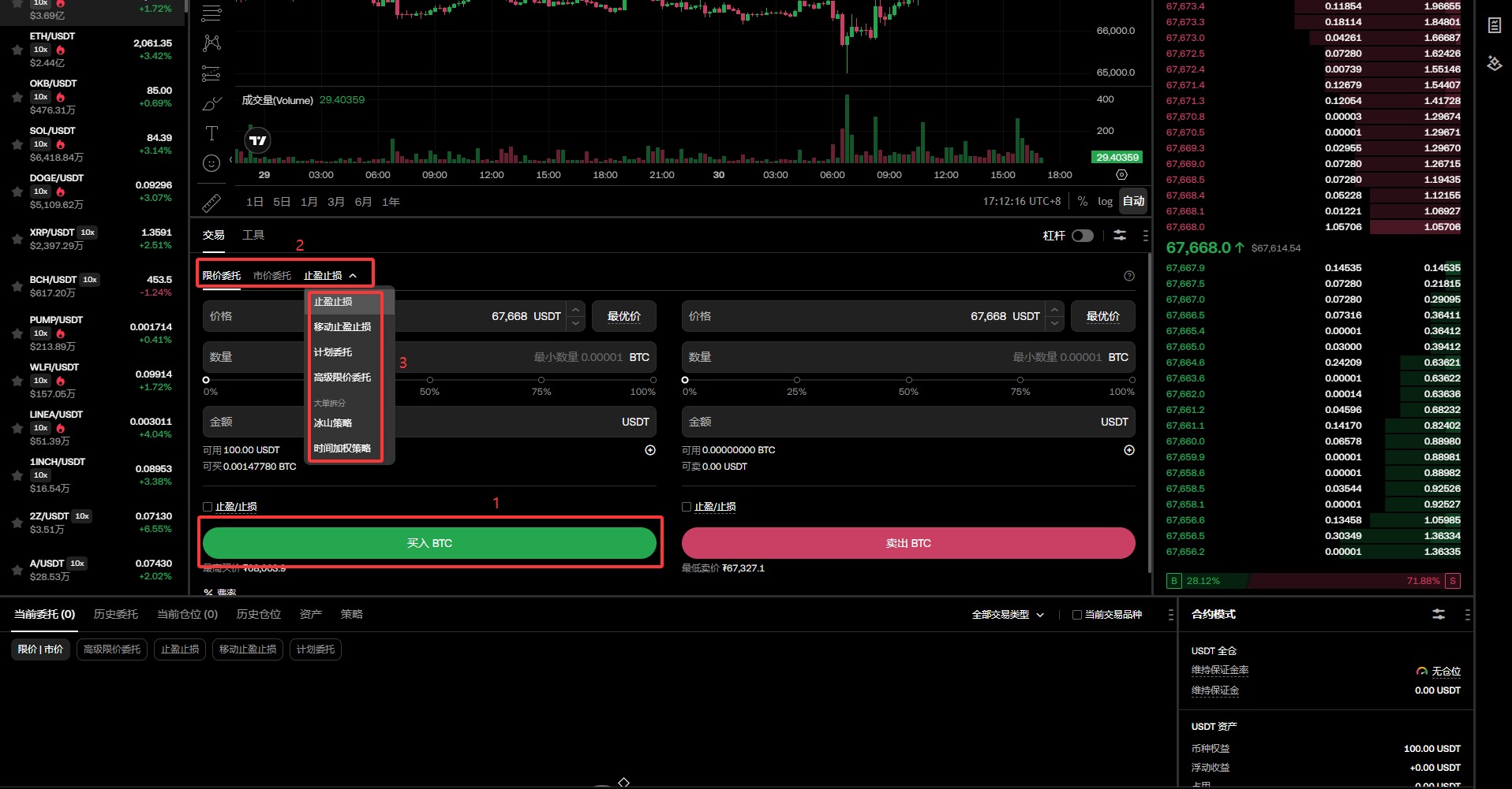 “现价委托”我们可以在这里输入一个价格,比如说现在市场价是67610多,我们觉得现在还略高,还会跌。我们可以输入一个自己想要的价格,比如说62000,输入之后我们在下方拖动数量或者直接在下方输入USDT的数量,点击【买入BTC】。就可以进行一个挂单。