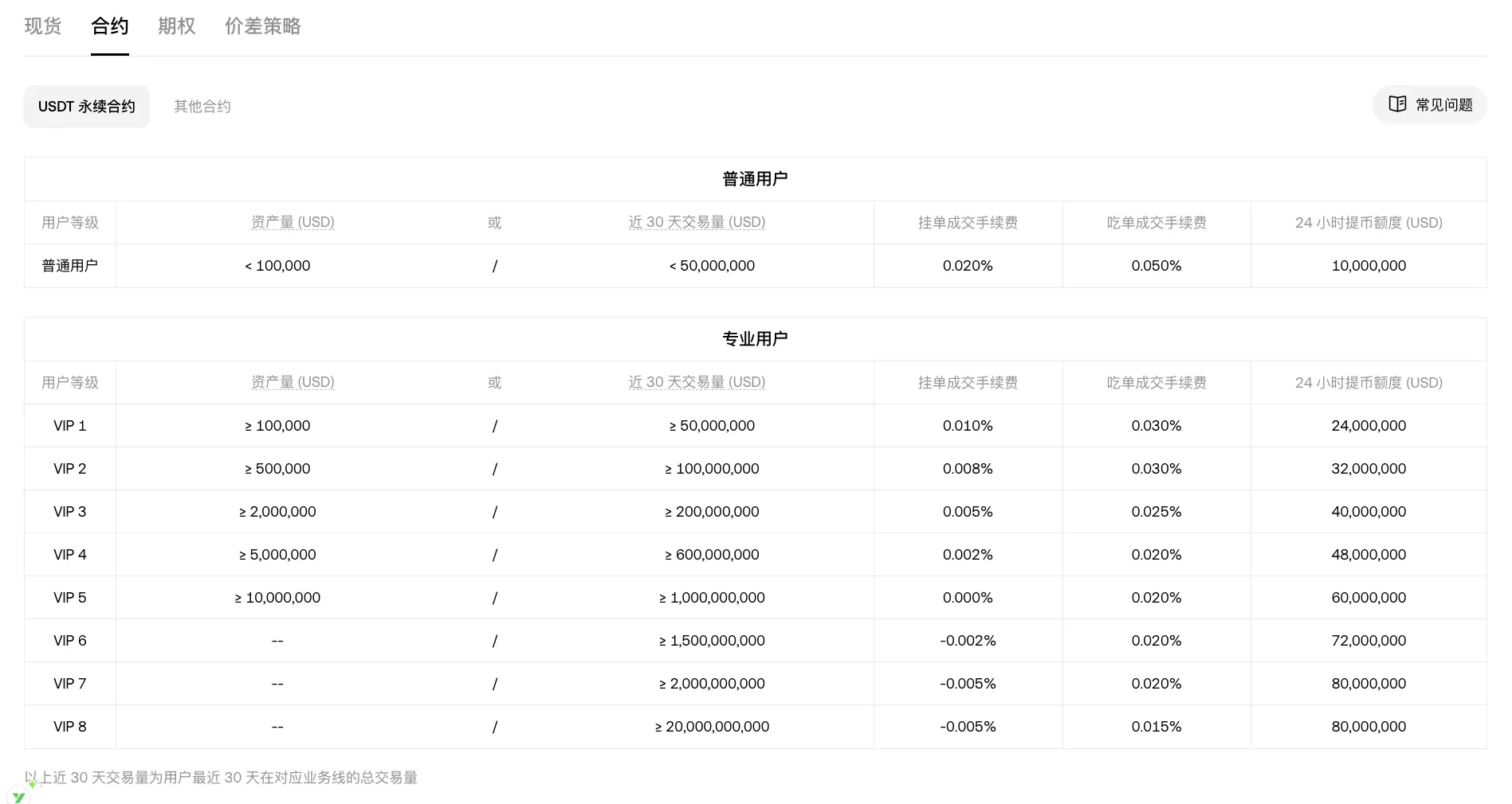 不同的等级决定了接下来一天的交易手续费率。根据交易量的不同,用户分为普通和专业两种等级。专业用户根据资产量和近 30 天交易量进行等级划分,不同等级享有不同的交易手续费