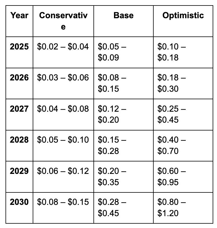 基准情景 假设交易量持续增长且产品成熟度提高,BOT可能在2030年达到 $0.30–$0.45 。