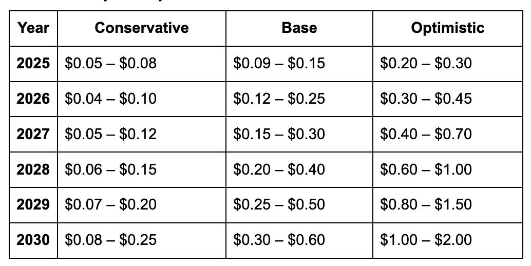 在 乐观情景 下,KDA可能经历复兴——可能通过分叉、桥接集成或类似迷因的复苏——如果在牛市周期中流动性和情绪改善,价格可能回升至1-2美元。