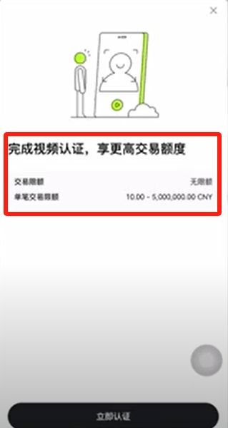C2C视频认证就是让你再次根据他的提示,进行更高的视频认证。新手我们可以只做身份认证就可以了,足够满足日常的需求。如果你在入金的时候,它提示你的权限不足,就需要进行C2C视频认证了。视频认证做完之后,基本上就是无限额的。