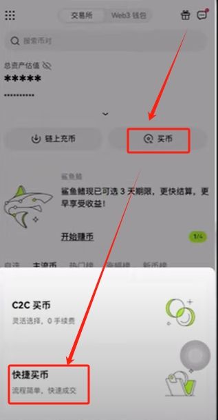 我们再返回到主页,点击【买币】,这里会弹出来两种,有C2C买币和快捷买币。他们的区别就是,“C2C买币”大小金额都可以,并且是自选商家。“快捷买币”适合比较小金额的,系统会自动给我们匹配商家。其实这两个功能都是提供给我们,让我们用人民币来买USDT的。