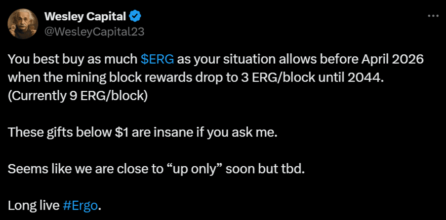 Ergo (ERG) 再次在加密货币圈内引起热议。最近,@WesleyCapital23 在Twitter 上的一篇帖子重新点燃了人们对ERG 价格潜力的兴奋,特别是随着2026 年即将到来的重要挖矿奖励减少。