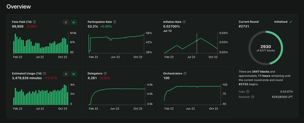 Livepeer 的一大优势在于,通胀率会根据流通中的质押代币数量自动调整。目前,LPT 代币的总供应量为 28,645,471.25 枚,其中质押代币数量为 12,641,094.24 枚。Livepeer 将这一比例(44.13%)称为“参与率”。