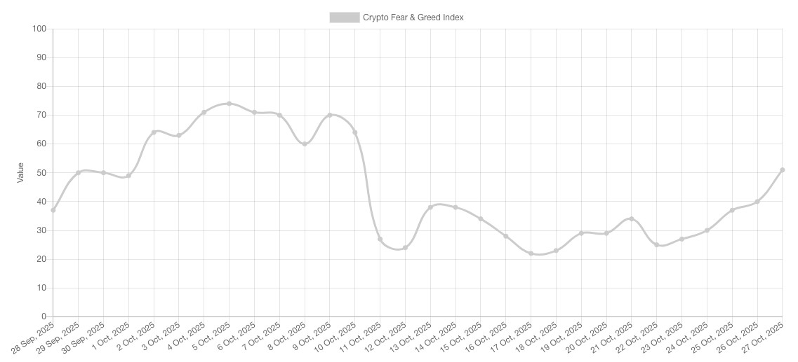 加密恐惧与贪婪指数数据显示,目前加密货币市场情绪处于‘中性’区域,