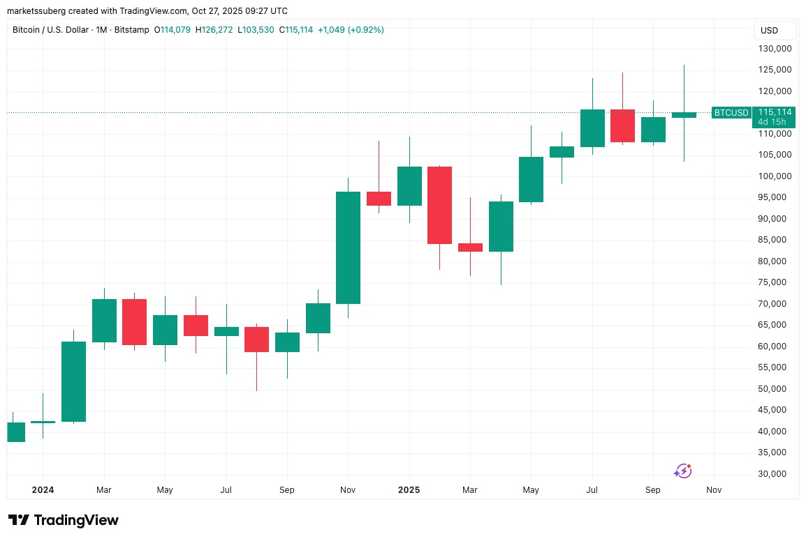 当前115,000美元水平使得BTC/USD较十月开盘价约上涨1%,帮助避免意外出现“红色”月份,