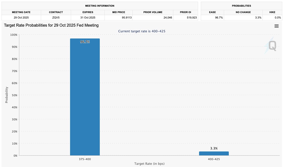 即便如此,市场普遍认为联邦公开市场委员会(FOMC)将选择降息0.25%;CME集团FedWatch工具数据显示概率超过95%。