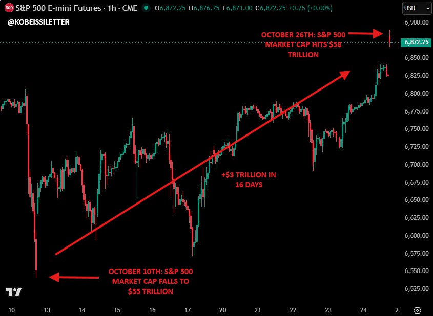 “自10月10日低点以来,S&P 500已增加+3万亿美元,此前特朗普总统宣布了100%的中国关税,”Kobeissi补充道。