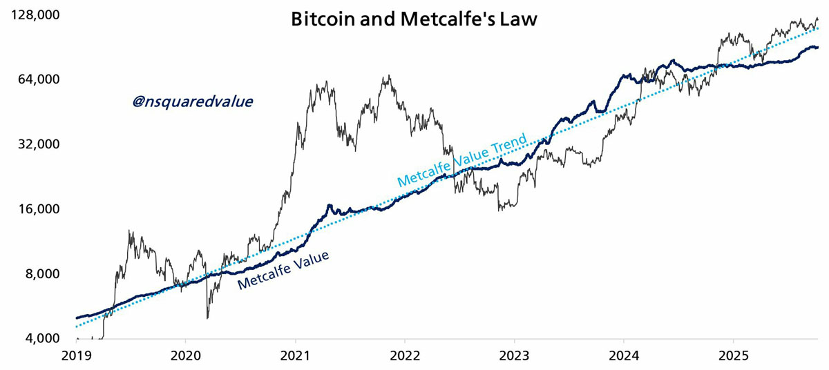 BTC/USD与Metcalfe定律图表。来源:Timothy Peterson/X