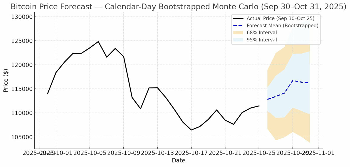 Peterson公布了AI模拟近期BTC价格走势的最新结果。115,000美元被设定为新的关注点,而125,000美元则成为十月底前值得关注的目标。