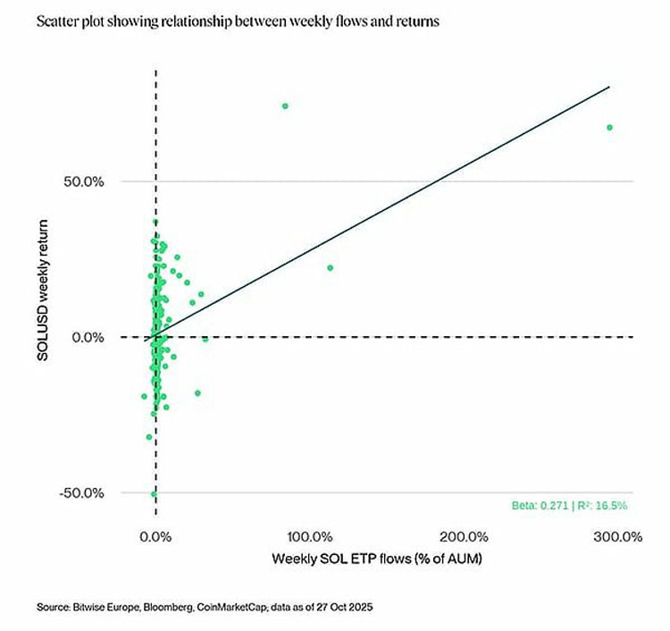 SOL 每周回报 vs SOL ETP 每周流量(占 AUM 的百分比)