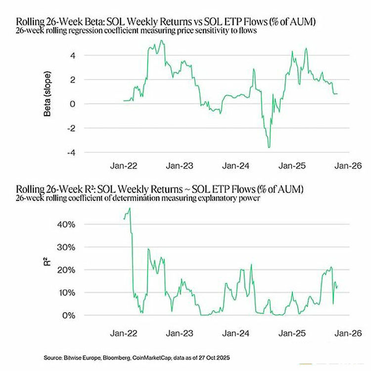 即使在当前水平下,资金流入对 SOL 价格走势的解释力也比以往任何时候都更强(到 2025 年,解释力将上升至约 20%),但散户动态仍然占主导地位。主要有两个原因: