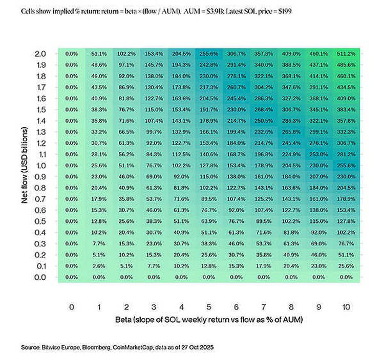 - 在当今市场条件的简化假设下,假设当前的流入与价格乘数(1.5 倍)保持不变,则10亿美元的净流入将对应SOL价格上涨约34%。