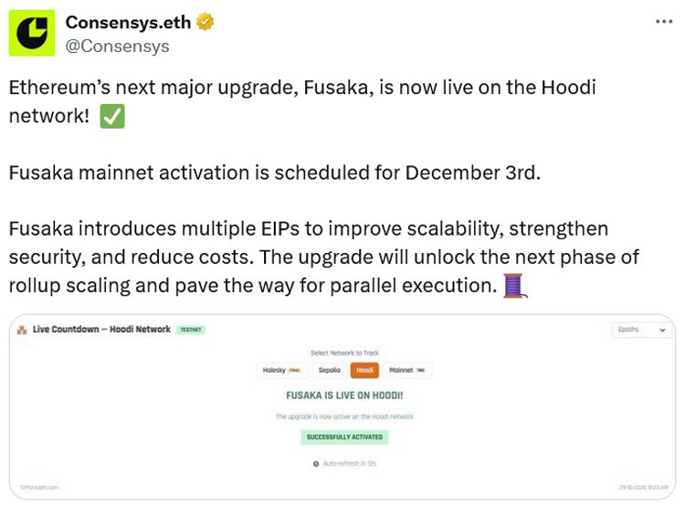 以太坊下一次重大升级Fusaka现已在区块链的最终测试网Hoodi上线,为12月3日主网发布奠定基础,届时网络将新增多项可扩展性与安全性改进。