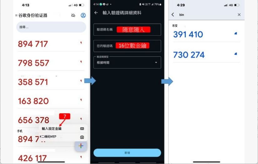 输入验证码详细数据,在你的验证码处粘贴「16位数密钥」,验证码名称输入Binance▶️「添加」▶️出现Binance及6位数字,纪录下来