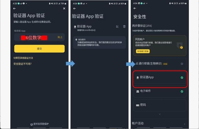 回到上面的步骤5,点击「下一步」▶️输入验证器内的「6位数字」▶️「提交」▶️出现验证器App验证画面▶️回到币安app的安全性画面,可以看到验证器App打绿色勾勾,表示2FA完成