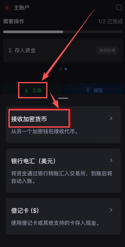然后在首页这里点击【充值】,选择【接收加密货币】。