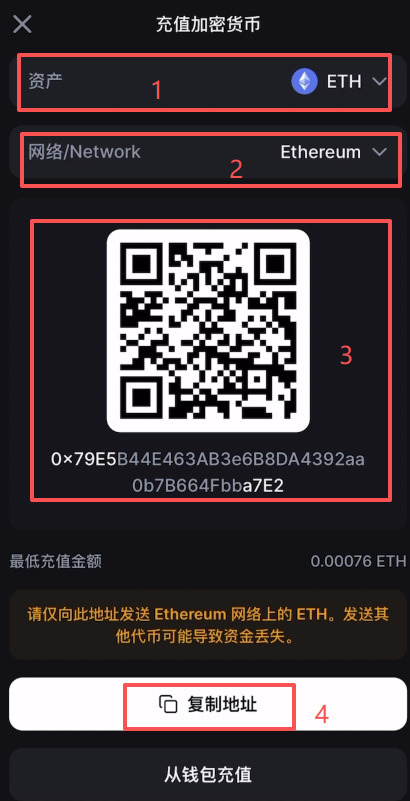 接下来我们就要把backpack交易所外面的钱给它充值到backpack交易所里面来。充的资产我们要选择ETH,网络就选择它自带的以太坊网络就可以了。下面这个二维码以及这串乱码就是我们的充币地址了,我们复制。