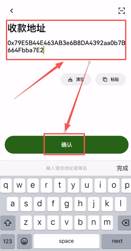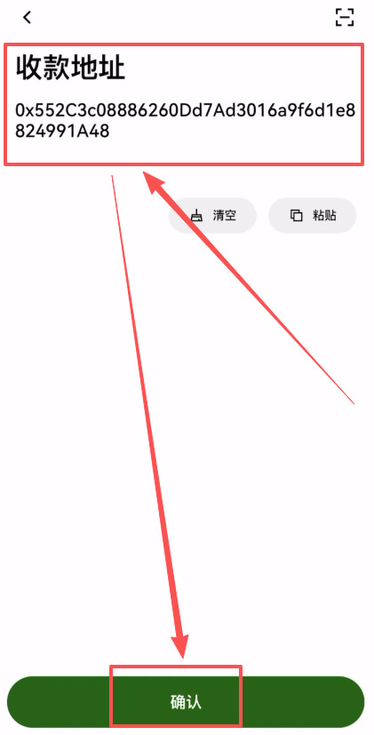 回到我们的OKX钱包,把刚才复制的地址粘贴进来,点击【确认】。