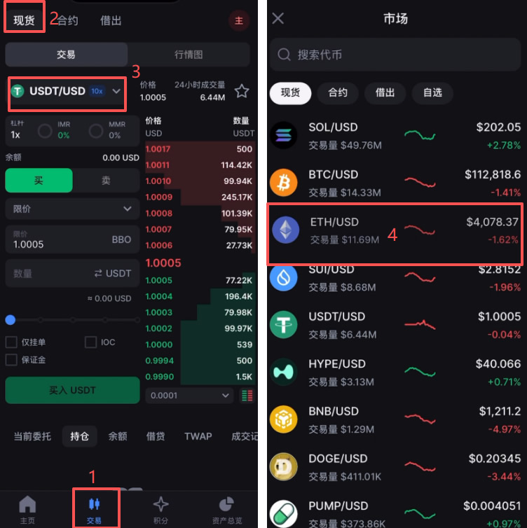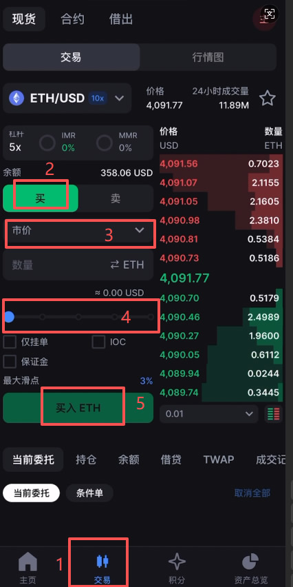 我们回到‘交易’,选择【现货】,选择【买】,还是“ETH/USD”这个交易对。我用市价全部买入。