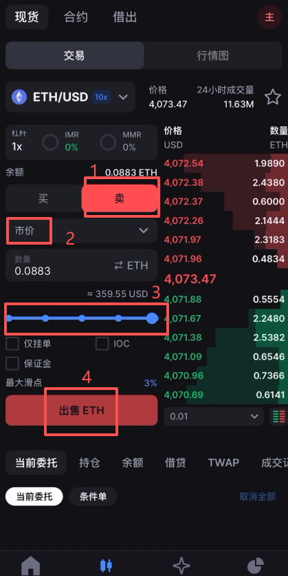 选择“市价”,我这里把它拉满,点击【出售ETH】。这样我们的以太坊就买成了USD。