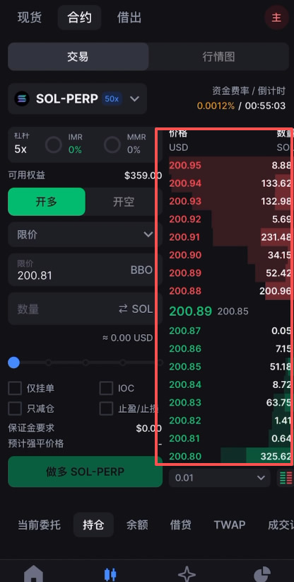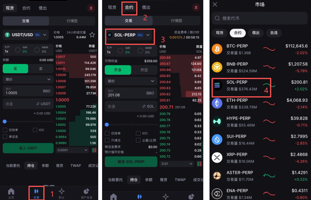 然后我们继续来到交易,去看一下他的合约交易。合约这里依旧是使用USD进行定价的。下方这里可以选择我们想要做多或者做空的交易对,比如说我现在就想做SOL的合约。