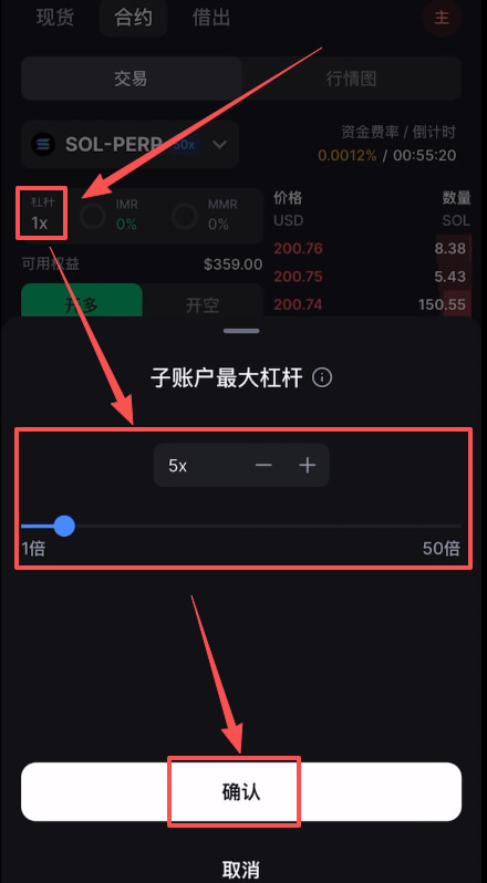 接下来下方这里有一个杠杆,它这里最高可以开到50倍,最低是1倍,比如说这里我就开5倍,点击【确认】。
