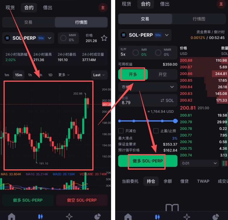 我们就可以回答行情图,来看一下15分钟的K线。我预测接下来它会有一个上涨的趋势,那我就可以选择买涨,也就是开多。点击【做多】。