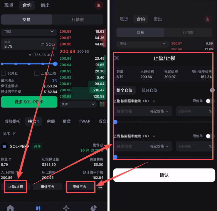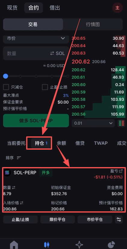 你可以在这里面去添加它的止盈止损,或者是如果你想要退场可以选择“限价平仓”或者“市价平仓”。限价平仓就是还需要我们设定一个理想的平仓价格,市价平仓就是以当前一个对我们最有利的价格直接平仓。比如说我这里就选择“市价平仓”。