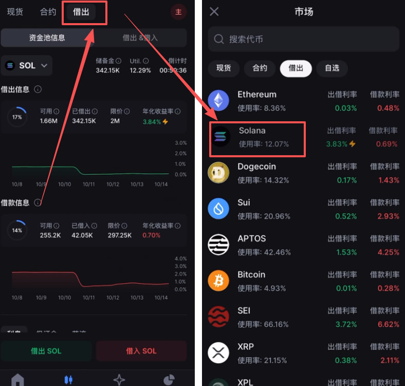 这里有他非常详细的借出信息和借款信息。如果你手里面有没用的资金,就可以在这里面进行借出,它会给你一个不错的年化收益率,我们就能够吃到它的利息。