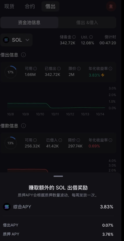 Backpack交易所还有一个比较有特点的功能就是“借出”。这里我们可以看到对应币种的资金池,上面会显示它的出借利率,以及借款利率。我们还是来看SOL这个币种。