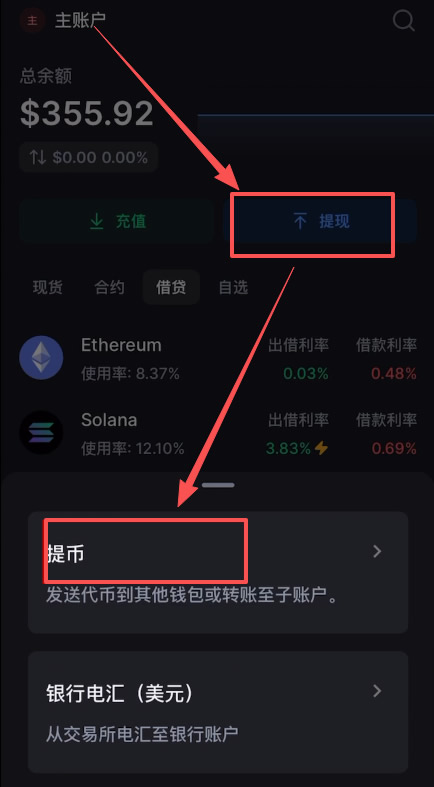 买完以太坊之后,我们回到首页。在这里面点击【提现】,选择【提币】。