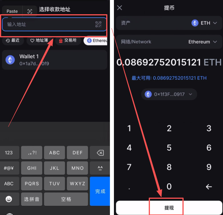 然后回到Backpack,把这个地址粘贴进来,然后选择【提现】。