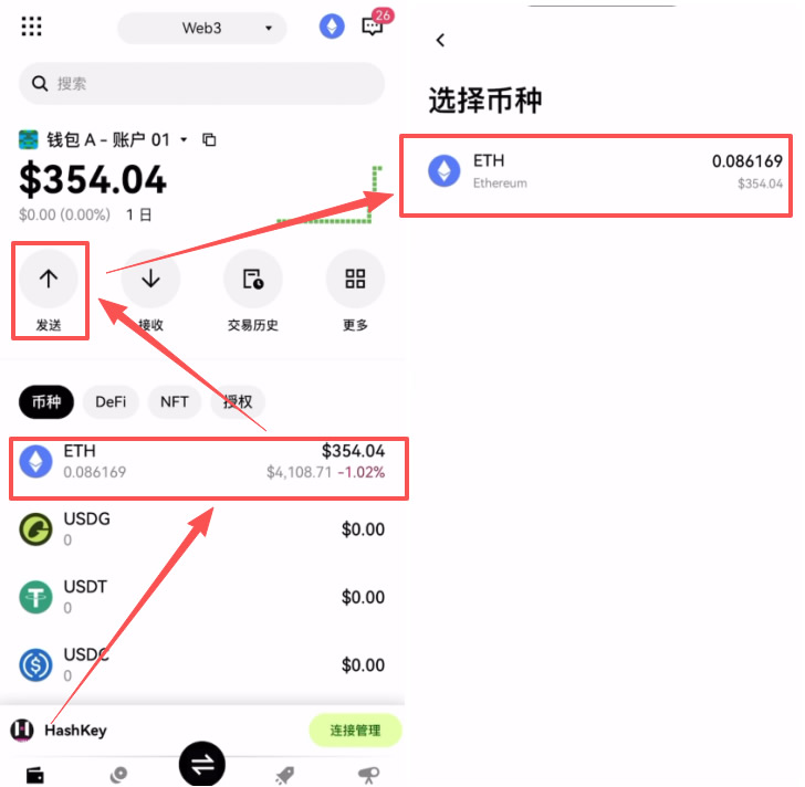然后回到我的OKX Web3钱包,点击【发送】,币种选择“ETH”。