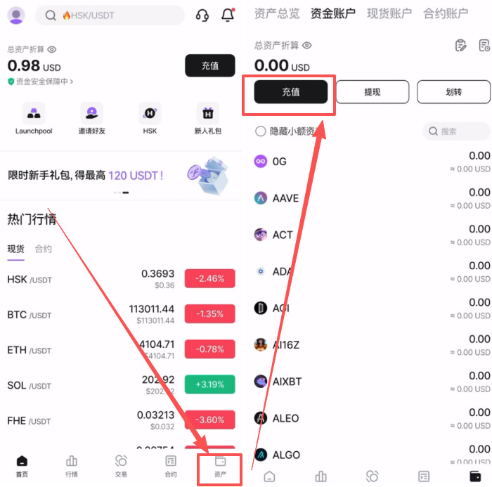 然后我们回到Hashkey,在“资产”页面选择【充值】。