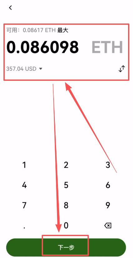 然后输入我们要提的以太坊的数量,我这里选择“最大”,点击【下一步】。再点击【确认】。