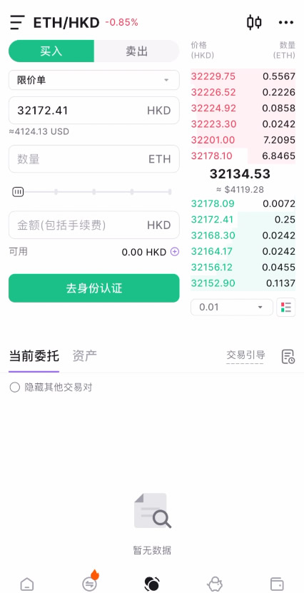 为了将我们的港币换成数字货币之后,能够很便捷的提走,你最好是选择以太坊这个币种,不要去购买比特币。在这我们就正常的去做身份认证,然后充值港币。充完港币之后在他的现货交易这里,选择“ETH/HKD”这个交易对。买完以太坊之后,我们就能够把这个以太坊提走了。