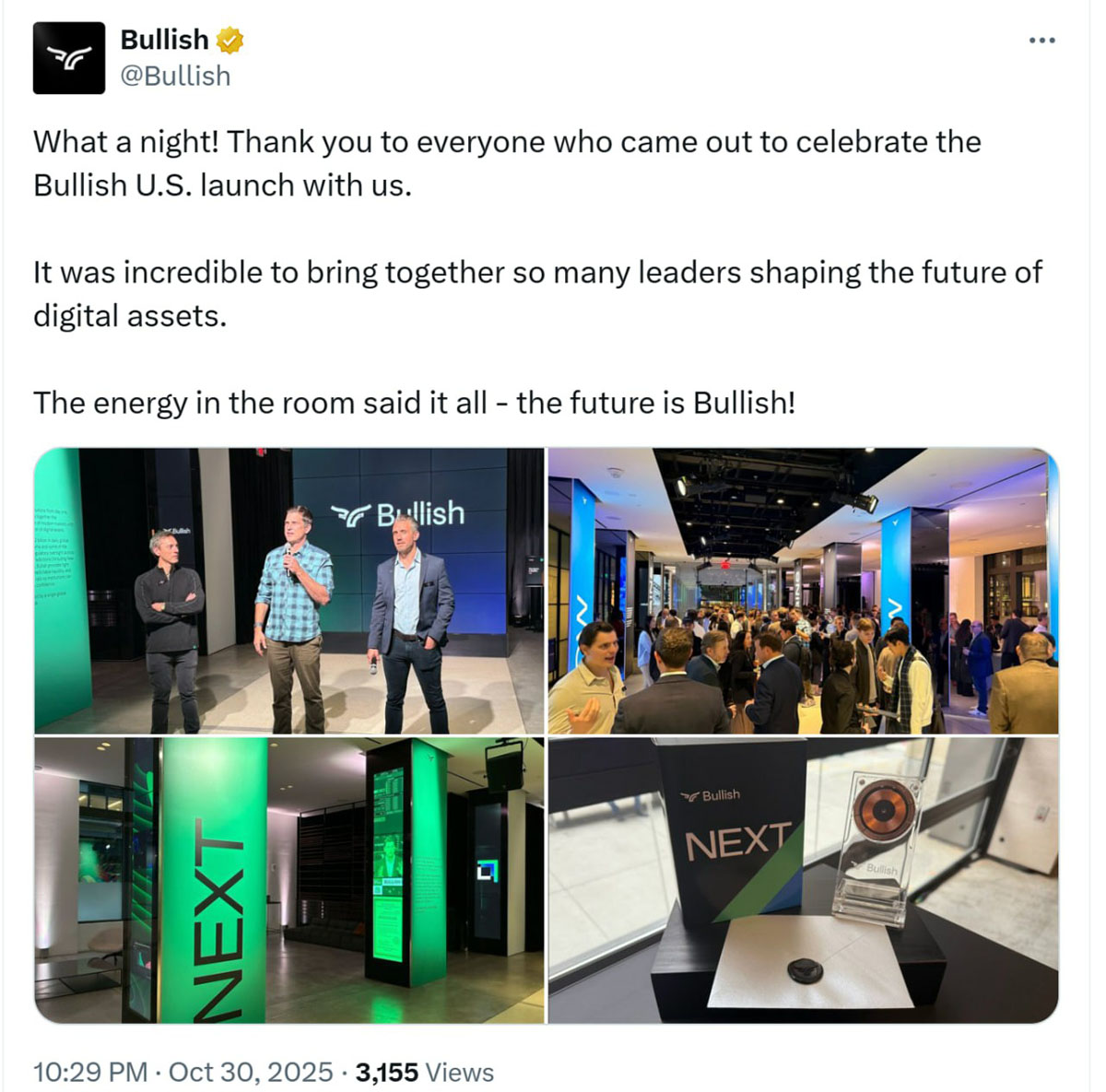 此次收购恰逢 Bullish 在纽约举行的美国发布会,该公司汇集了数字资产领导者来庆祝其扩张。“房间里的能量说明了一切——未来是看涨的,”该公司在活动结束后在 X 上发帖说 。