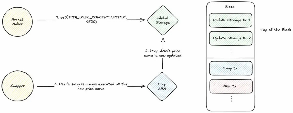 虽然标准 EVM 架构使此类操作成本高、风险大,但新的设计为解决这个问题提供了不同的方法。结合链上全局存储智能合约和链下构建器策略的新设计,可创建专用「快速通道」,保证区块顶部执行更新,同时建立本地、受控的费用市场。这不仅使 Prop AMM 在 EVM 上可行,也可能为所有依赖区块顶部预言机更新的 EVM DeFi 带来变革。