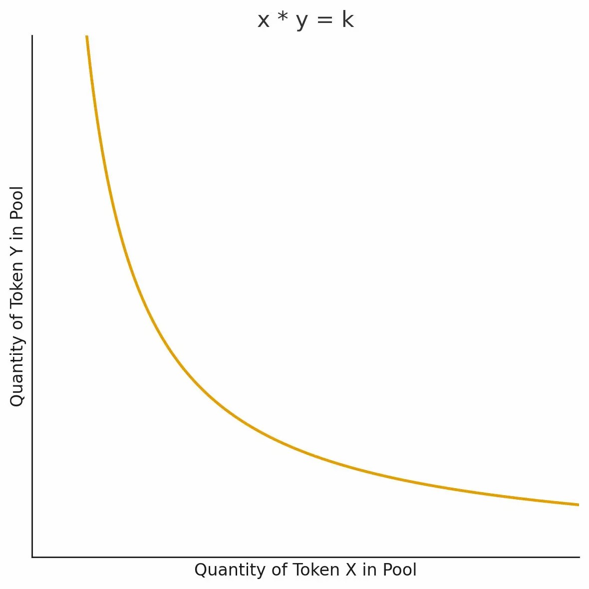 若有交易者想买入 1 WETH,他需要向池中加入 USDC,使池中 WETH 减少到 99。为了保持恒定乘积 k,新的点 (x, y) 仍需落在曲线上,因此 y 必须变为 40,000,000 / 99 ≈ 404,040.40。也就是说,该交易者为 1 WETH 支付了约 4,040.40 USDC,比最初价格略高。这种现象称为「价格滑点」(slippage)。这正是 x*y=k 被称为「价格曲线」的原因:任意可交易价格都必须落在这条曲线上。