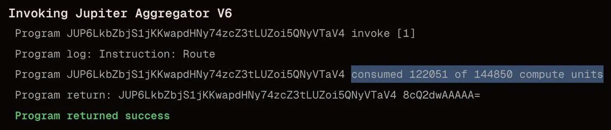 Jupiter Swap:通过 Jupiter 路由的 swap 可达 ~100,000 CU,总费用 0.000005 SOL