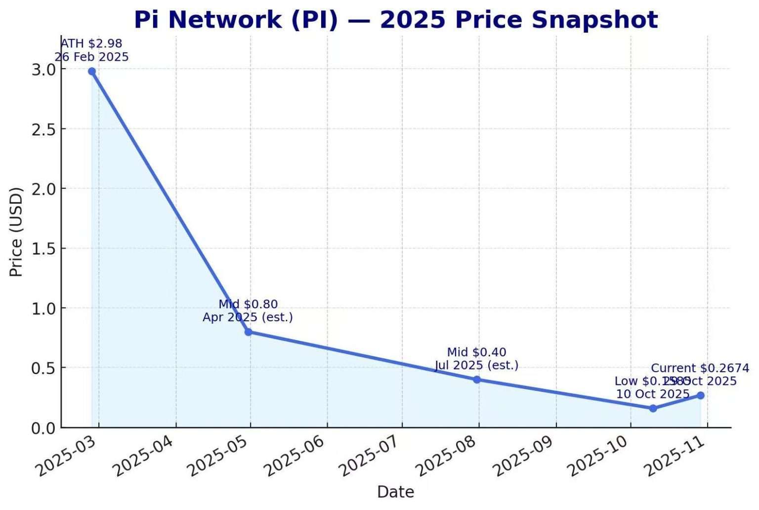Pi Network (PI) 2025 年价格走势预测:从历史最高价 2.98 美元降至当前价格 0.267 美元