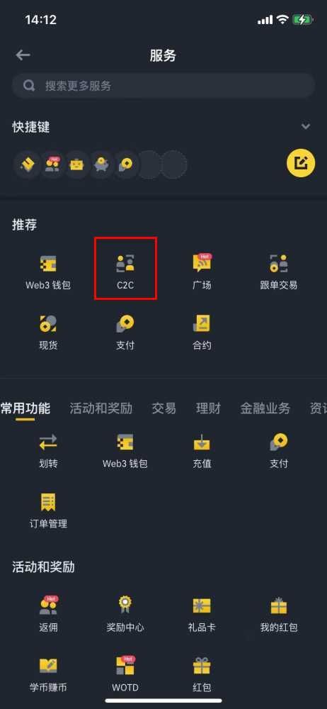 打开币安APP并登录,从首页点击“更多”,找到"C2C"