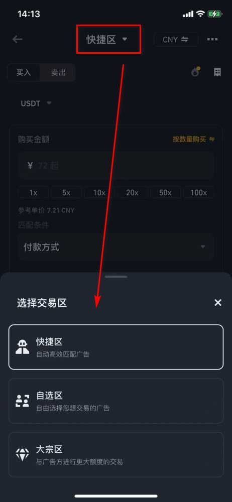 点击顶部的交易区下拉按钮,选择交易区。对于新手,可以选择快捷区,让系统自动匹配商家。如果已经很熟悉了,有长期的合作商家,可以通过自选区找到对应的商家,进行下单。
