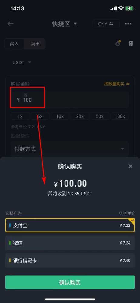 这里我们选择“快捷区”,C2C交易中不仅可以购买USDT,默认显示USDT,输入购买金额,点击"买入USDT",会弹出确认购买,这里可以选择使用的支付方式:支付宝、微信或银行借记卡。选择“支付宝”,点击“确认购买”,会弹出一个“T+1"提币安全保障”的提示