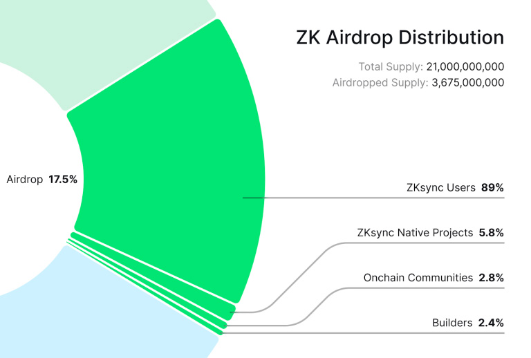 根据官方公告,zkSync 将于下周向695,232 个符合条件的钱包分发36.75 亿个ZK 代币,该分配占ZK 代币总数210 亿枚的17.5%,用于奖励早期采用者和贡献者。