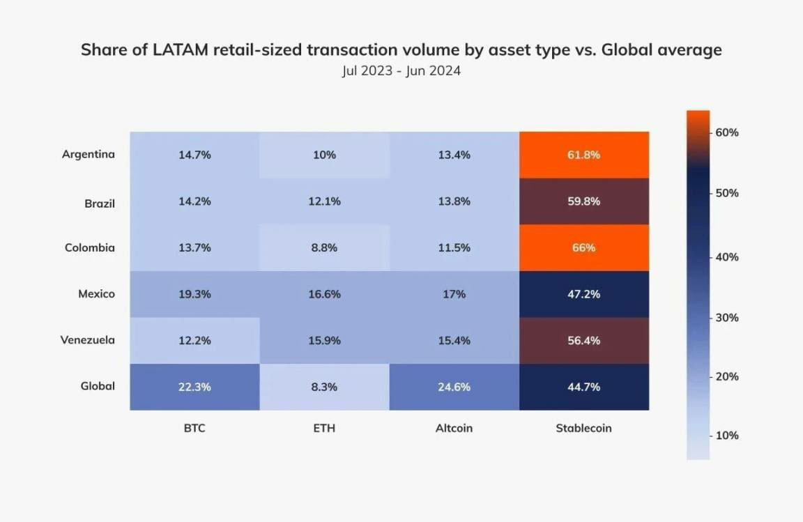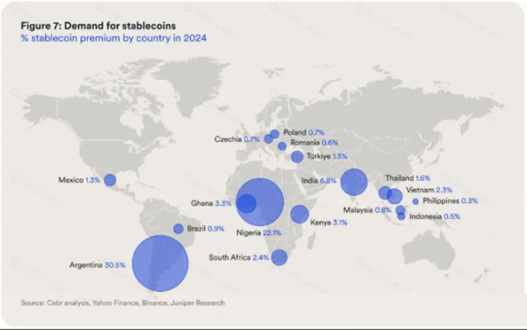 高通胀使得本地定价变得不可能。在阿根廷,约 62% 的加密货币交易活动集中在稳定币上,而 USDT 的交易价格一直高于官方美元汇率。