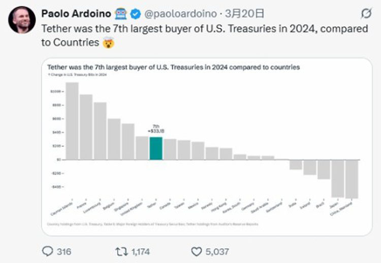 到 2024 年底,Tethe 当时已成为美国国债的第七大外国买家,在年度购买量上超过了加拿大和墨西哥等国家。