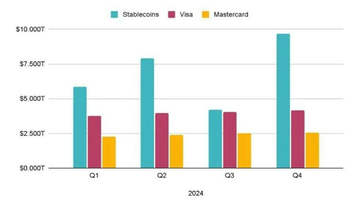 图表:2024 年季度链上稳定币转账量(蓝色)与 Visa(粉色)和 Mastercard(黄色)支付量的对比。到 2024 年第四季度,稳定币网络处理的价值已显著超过主要卡网络。