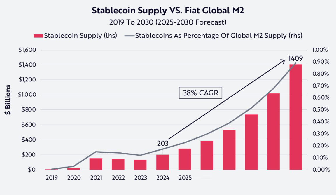 相比之下,全球稳定币市值约为 3000 亿美元,仅占美国 M2 货币供应量的约 1%。虽然绝对值仍然很小,但这种对比凸显了稳定币的快速增长及其巨大的扩张空间。稳定币实际上是运行在区块链上的数字美元,如果它们能够占据 M2 货币供应量的一小部分,其市场规模就可能达到数万亿美元,从而重塑支付、汇款和全球美元分配格局。